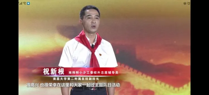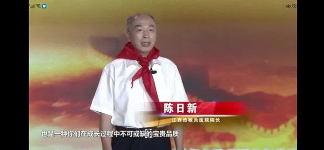 第四位榜样是江西中医药大学附属医院副院长、热敏灸医院院长——陈日新。在此次疫情中,陈院长带领他的团队运用了中医艾灸来治疗病患,让中医在时代焕发出了新的光彩。把几千年前的医术传承、创新出更有效的治疗方案,把中医药这一块中华瑰宝,继承发展、推陈出新。陈院长希望:全体少先队员要坚定信念,做祖国合格的建设者和接班人,让中医药这一瑰宝走出国门,走向世界!