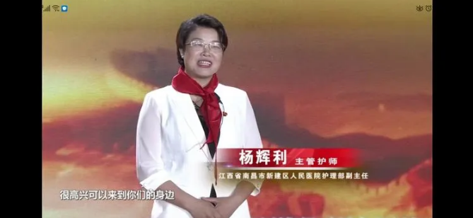第三位榜样是江西省南昌市新建区人民医院护理部副主任、主管护士——杨辉利。她给我们讲了一个通过与病患建立友谊,帮助病患建立信心积极治疗的故事。作为一名主管护士,除了给病患治疗,还要为病患加油打气。她感恩,感恩全体医护人员的付出和团结协作,感恩病患的信任与肯定,她呼吁全体少先队员们:心怀感恩、学会奉献。做一个眼中有光,心中有爱的新时代社会主义接班人。