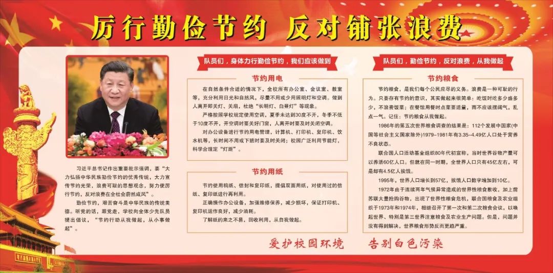“一粥一饭,当思来处不易;半丝半缕,恒念物力维艰”,近期习近平总书记对制止浪费行为作出重要指示,要求切实培养节约习惯,在全社会营造浪费可耻、节约为荣的氛围。对此,厂长资源 少先队大队部积极贯彻落实习近平总书记指示,开展了“厉行节约你我同行”为主题的系列活动。