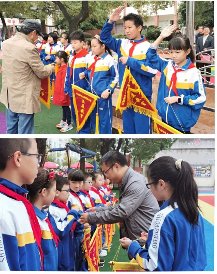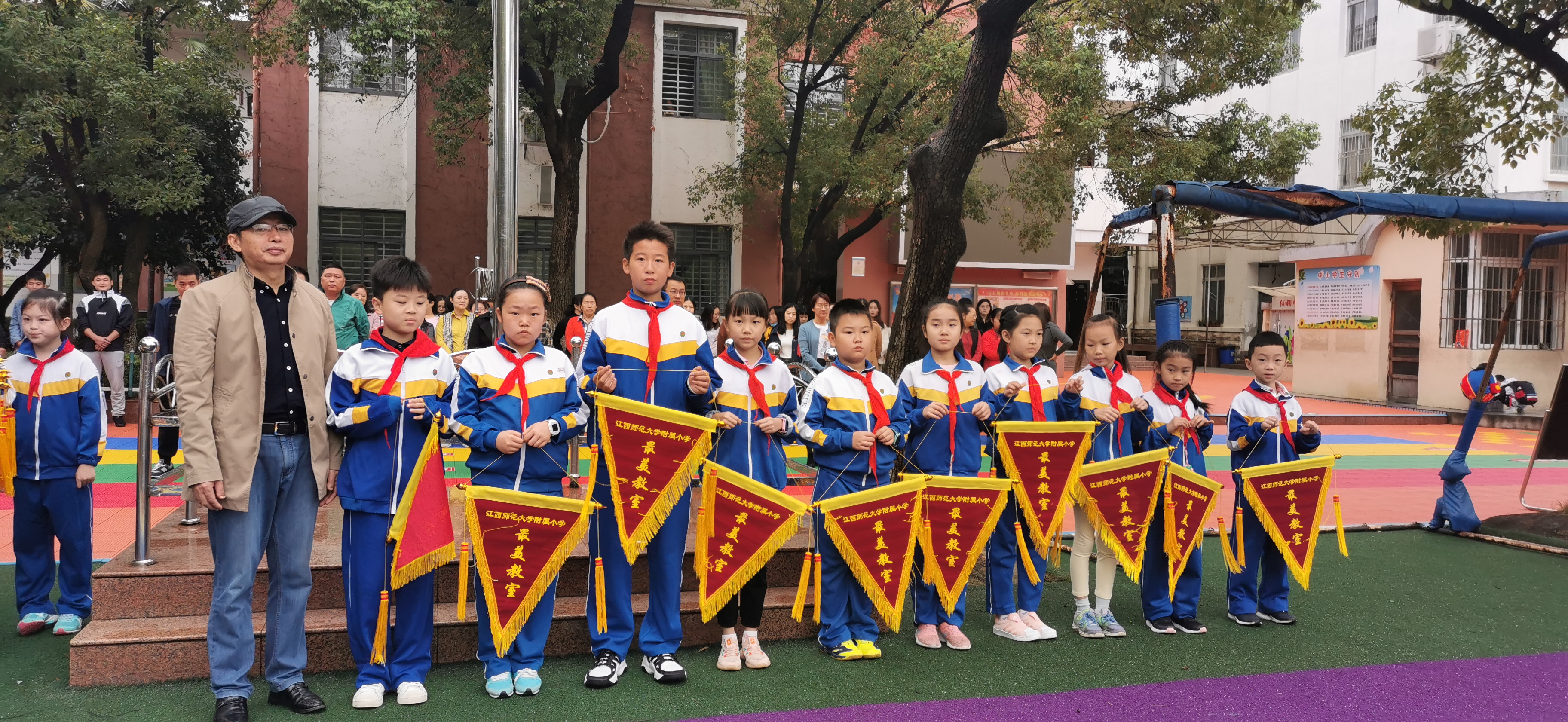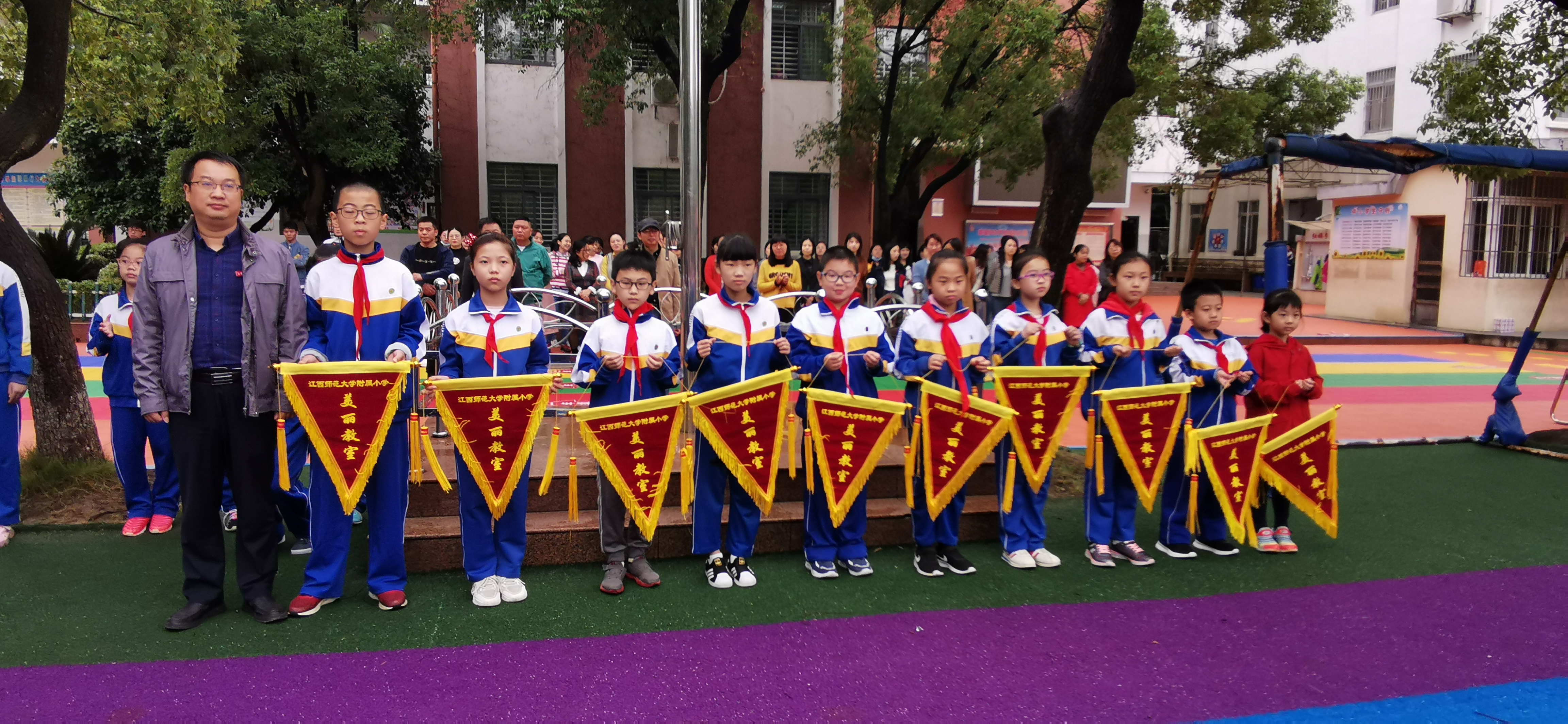 甘党根书记和邓信哲副校长为获称号的班级授旗。