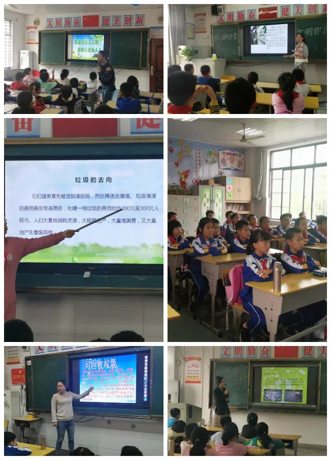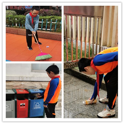 课间,师生们对校园进行了清扫、垃圾分类的处理,做文明小市民。
