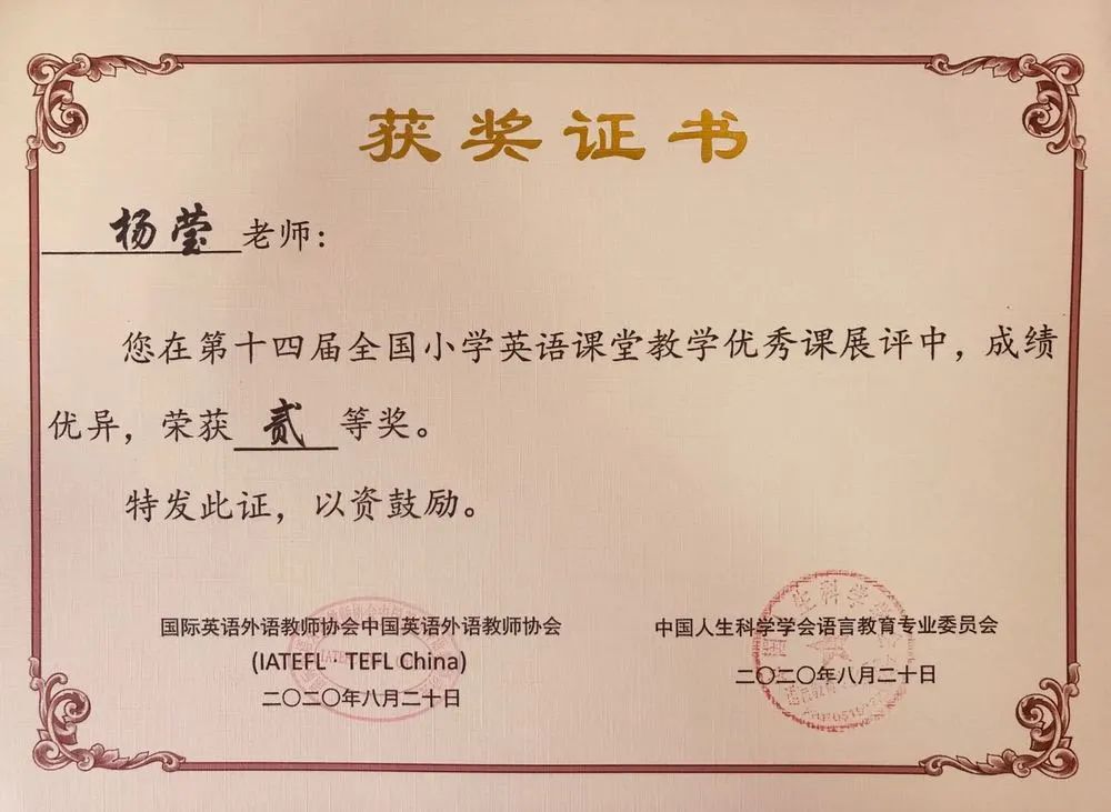 热烈祝贺厂长资源 杨莹老师在第十四届全国小学英语教师教学基本功大赛中荣获“小学英语课堂教学优秀课展评二等奖”。
