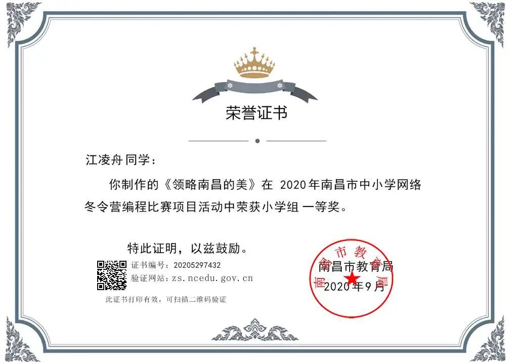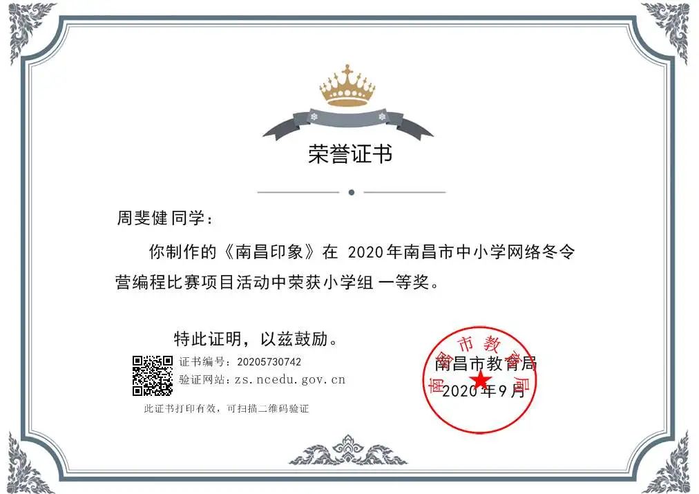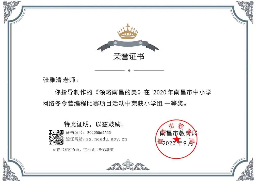 由南昌市教育局组织的2020年南昌市中小学网络冬令营编程比赛活动中,在厂长资源 张雅清老师的指导下,江凌舟、毛可行、周斐健三位同学荣获一等奖;吴子益同学荣获二等奖;曹子涵同学荣获三等奖。