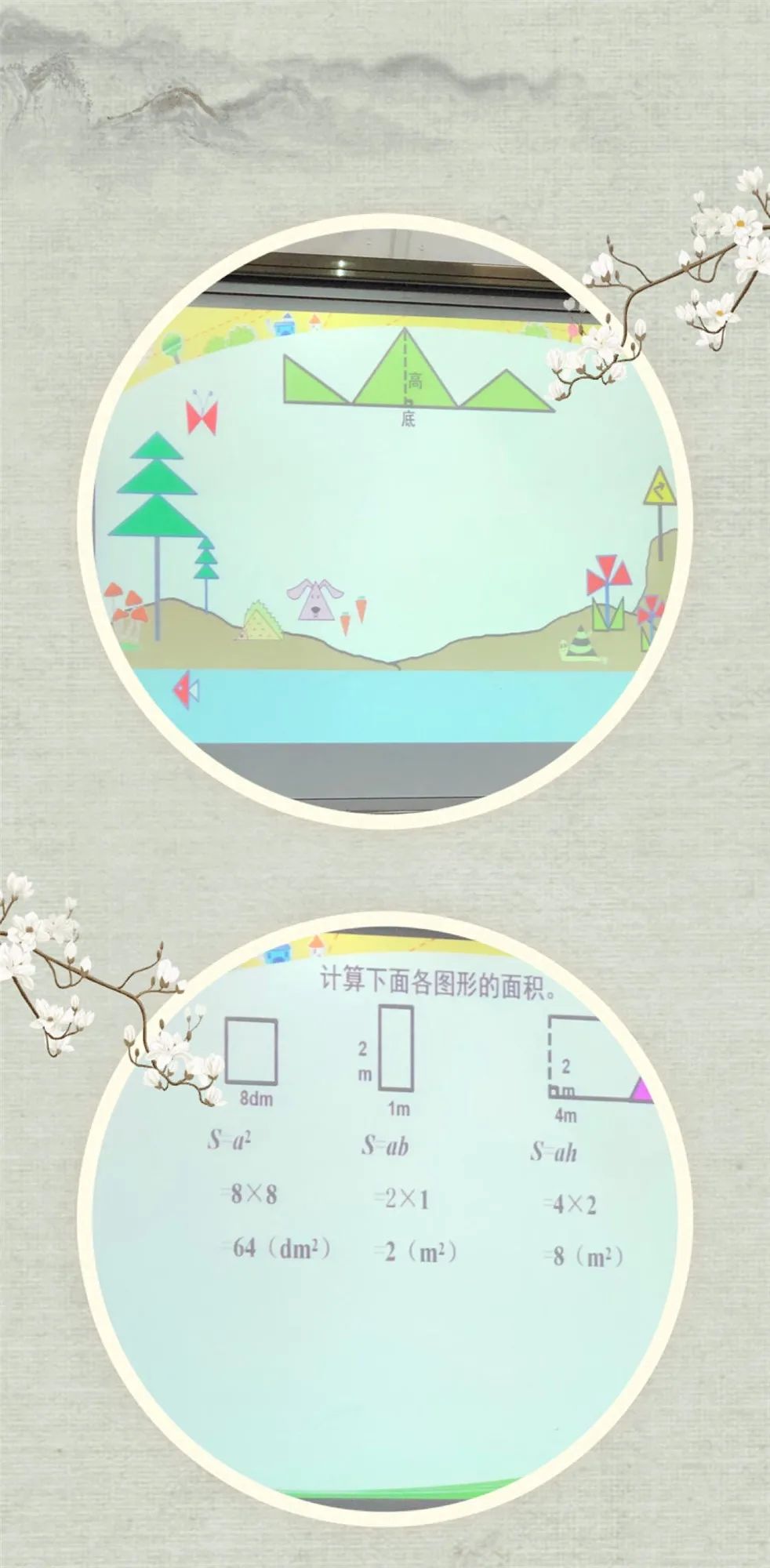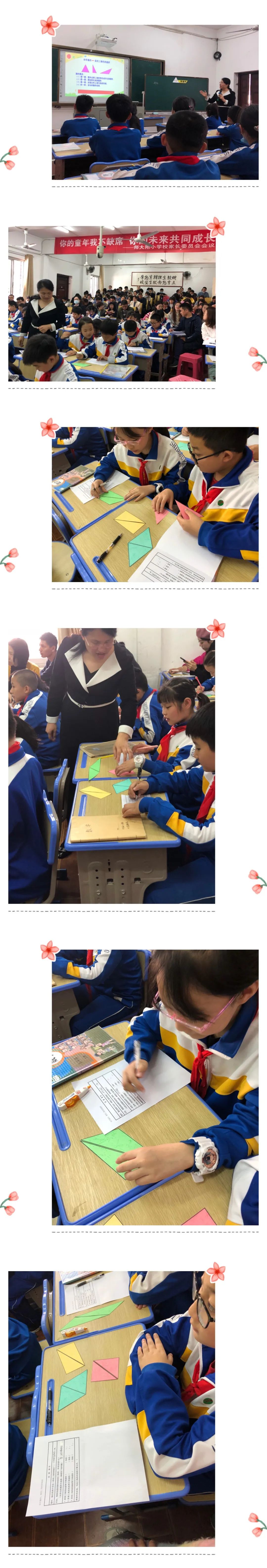 为了突破本节课的重难点,邱老师先让学生把已学过的长方形、正方形和平行四边形分割成两个完全一样的三角形。