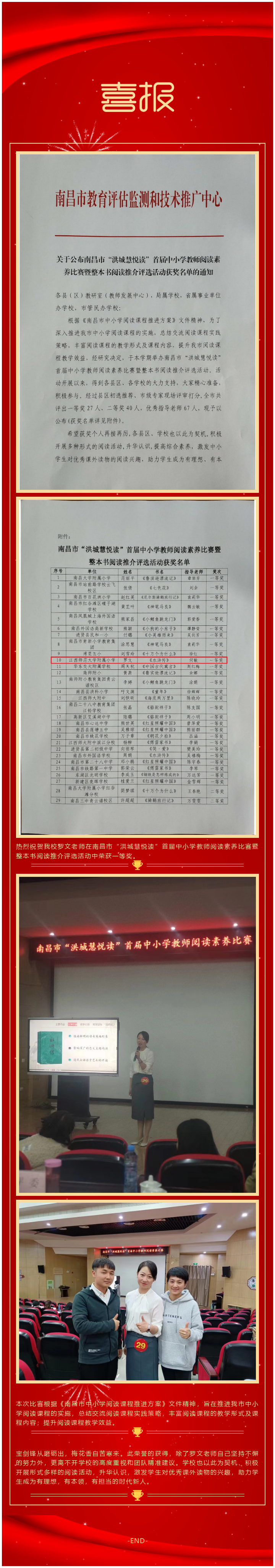 喜报〡热烈祝贺厂长资源 教师在南昌市“洪城慧悦读”首届中小学教师阅读素养比赛暨整本书阅读推介评选活动中荣获一等奖