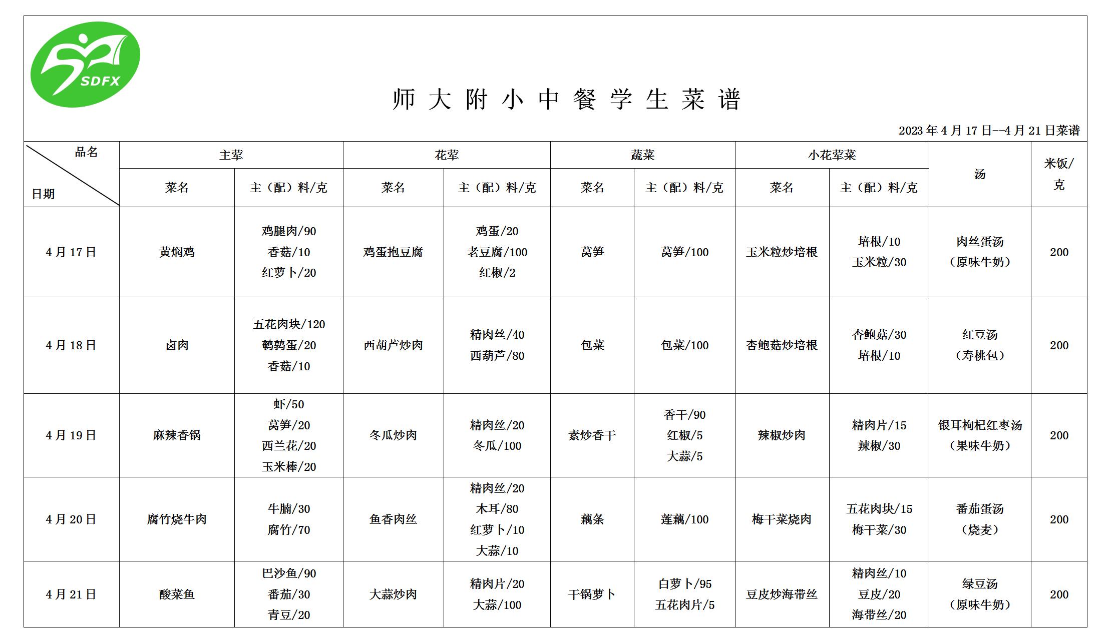 师大附小2023年4月17日-4月21日食谱