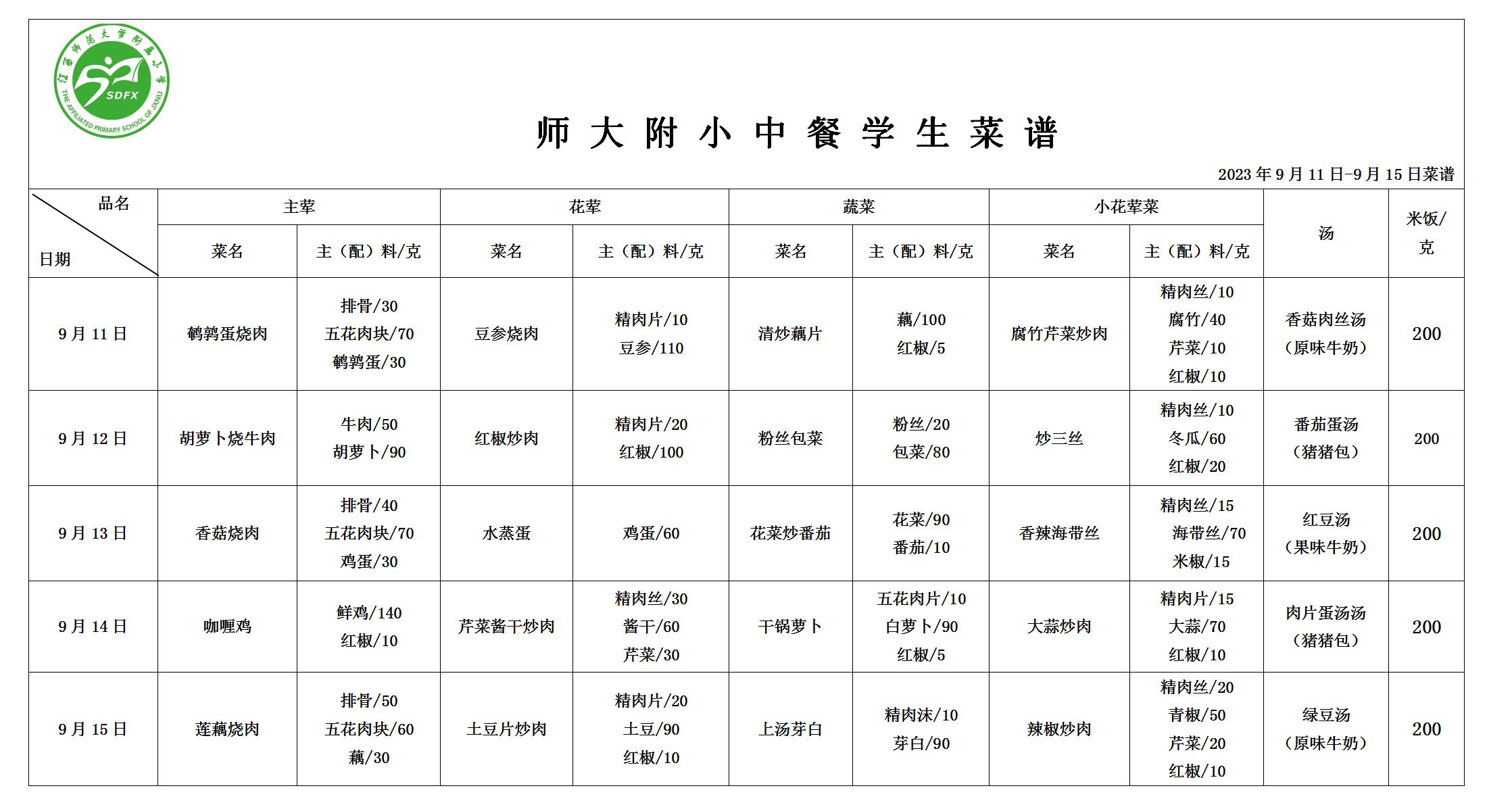 师大附小2023年9月11日-9月15日食谱