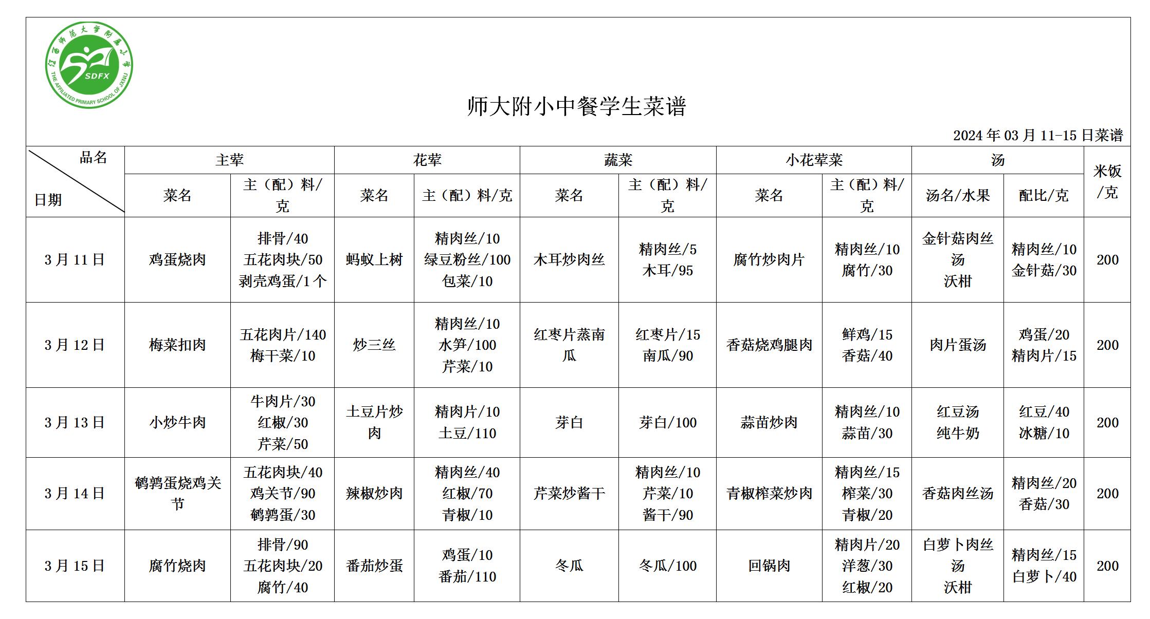 师大附小2024年3月11日-3月15日食谱