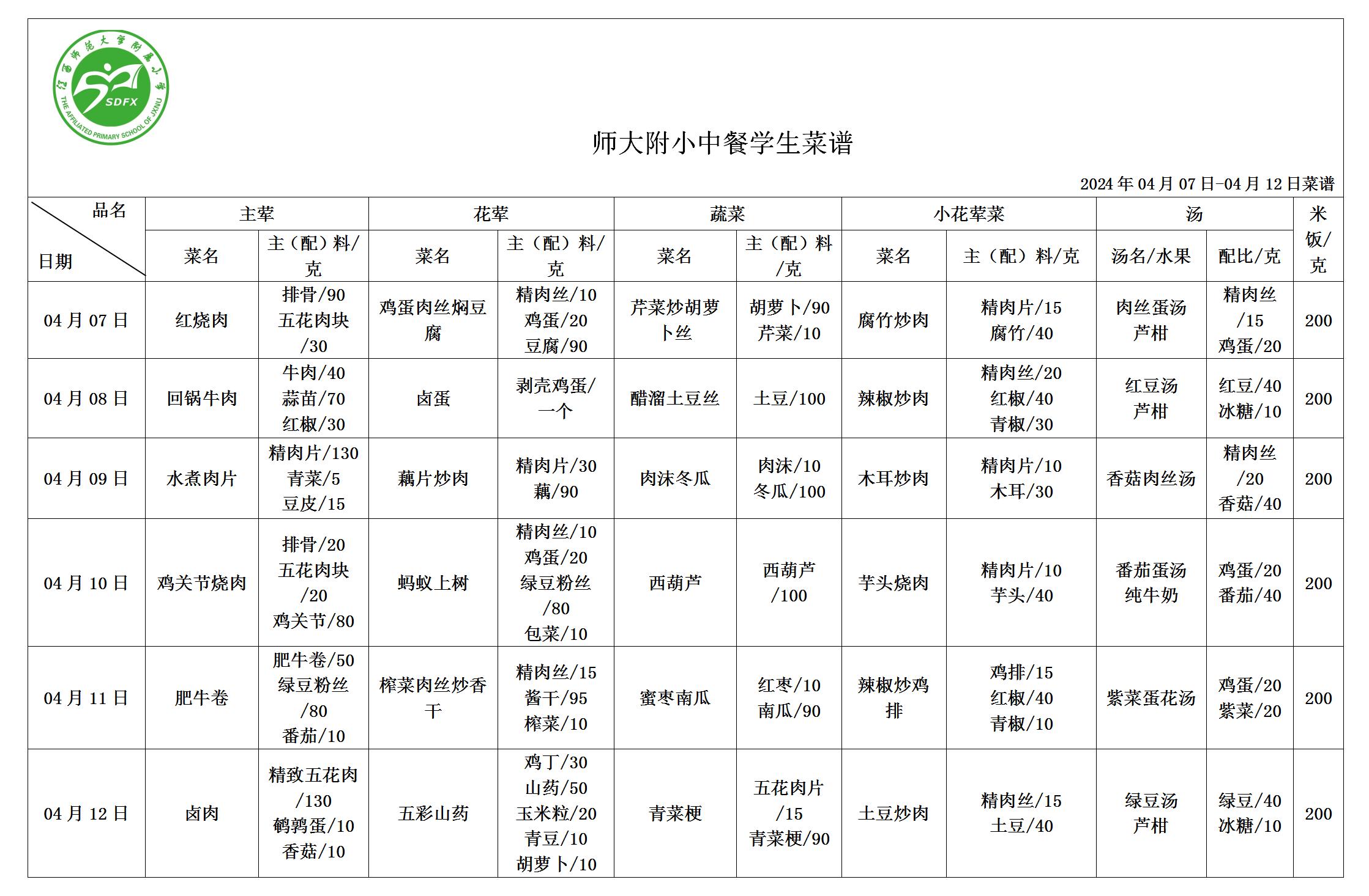师大附小2024年4月7日-4月12日食谱