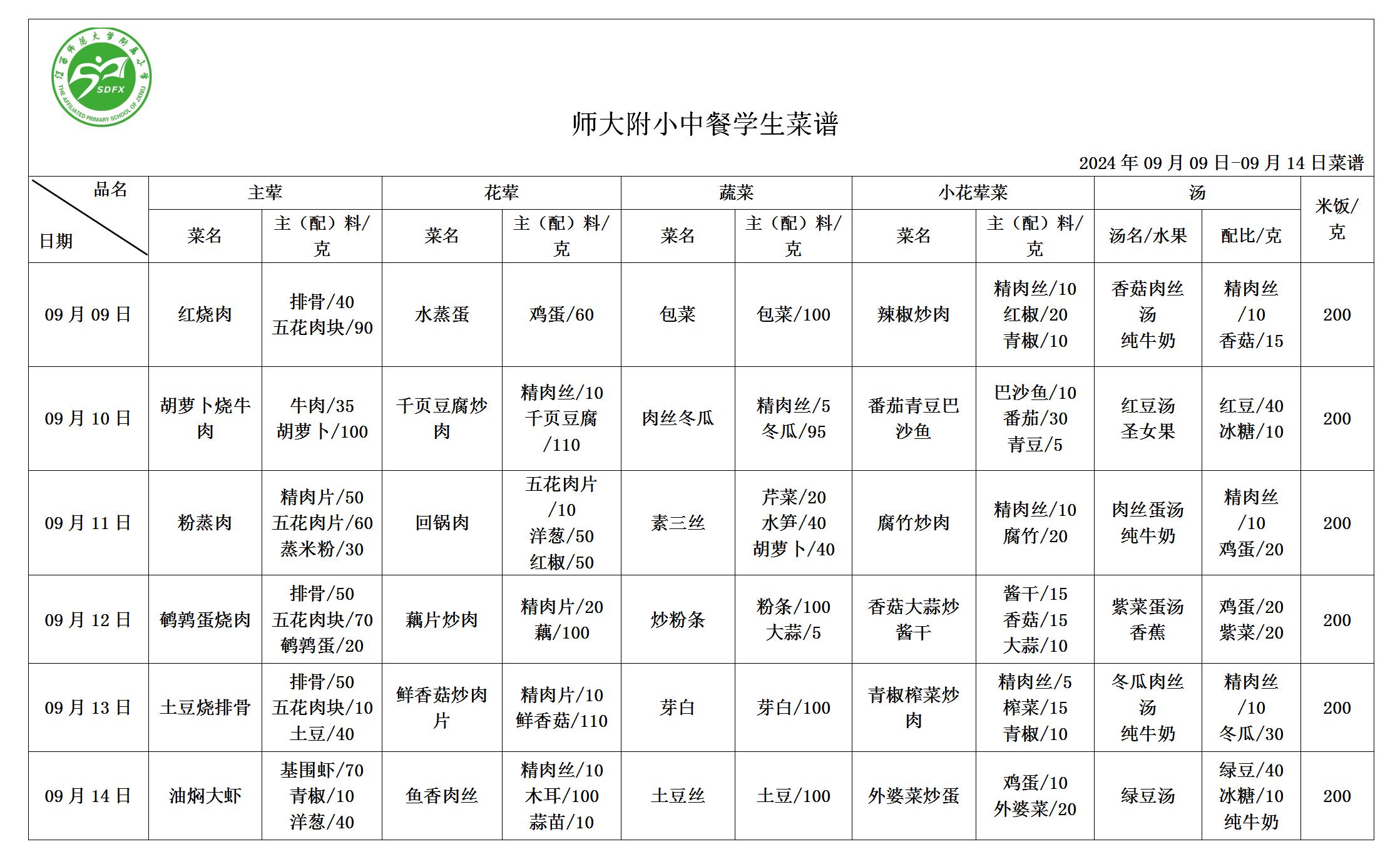 江西师大附小2024年9月9日-9月14日食谱