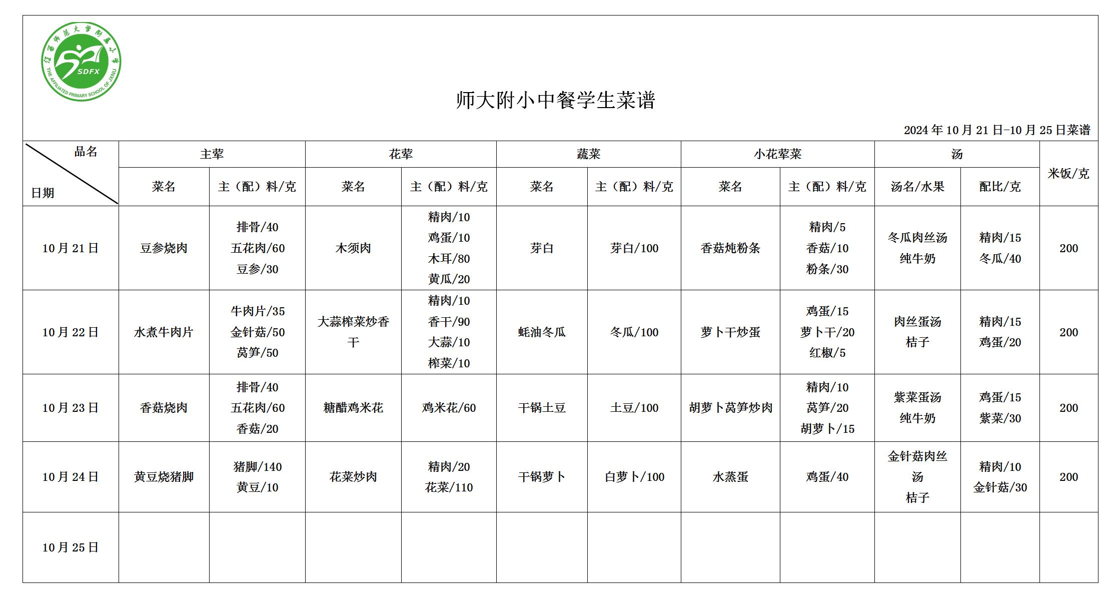 师大附小2024年10月21日-10月24日食谱