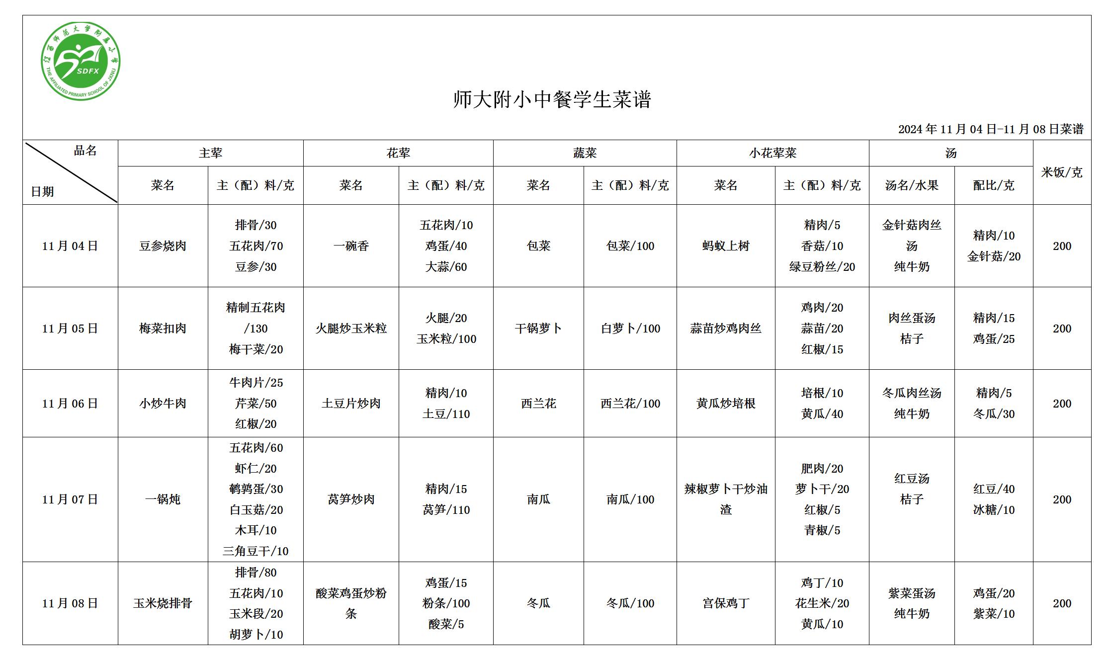 师大附小2024年11月4日-11月8日食谱