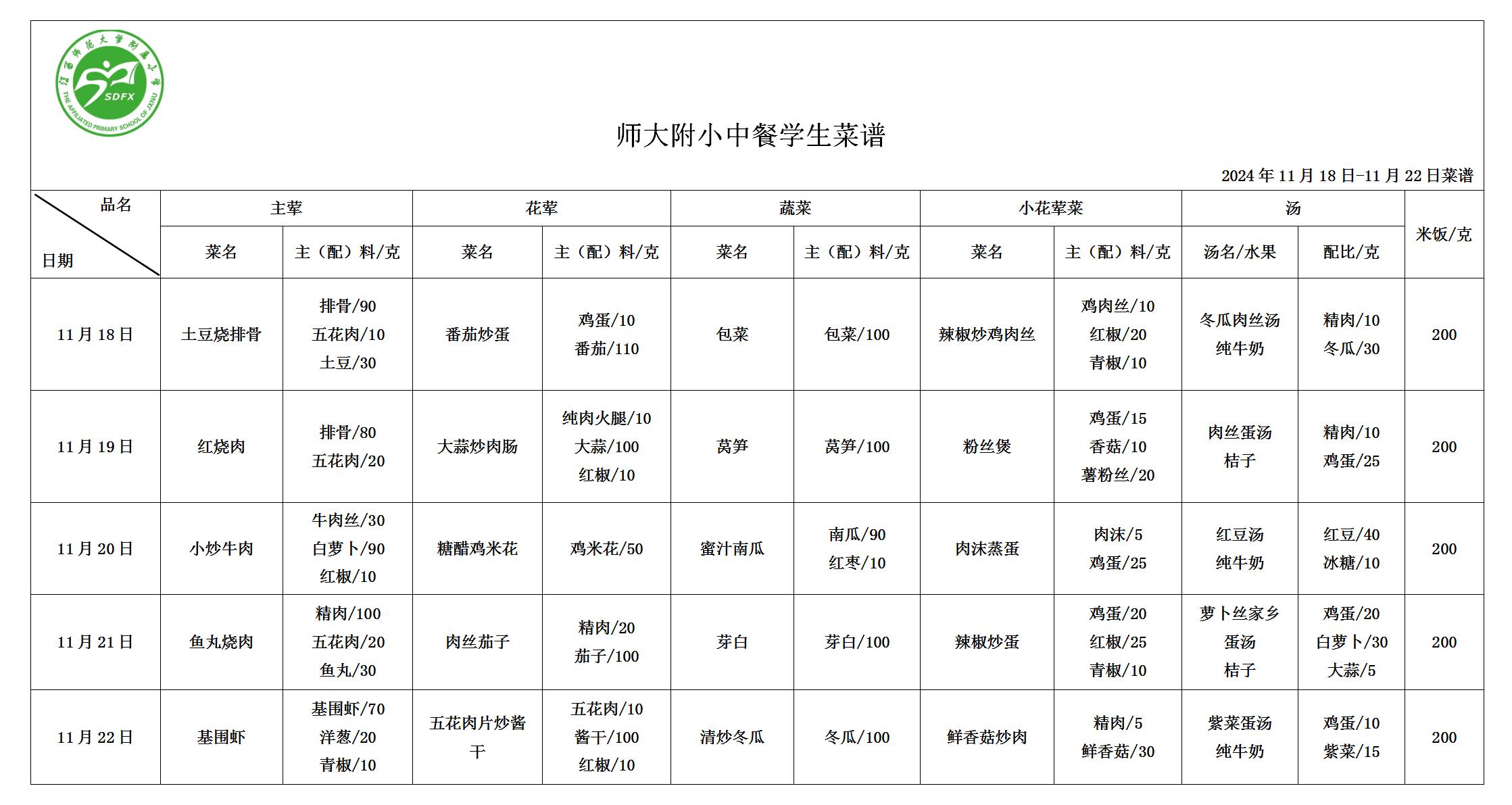 师大附小2024年11月18日-11月22日食谱