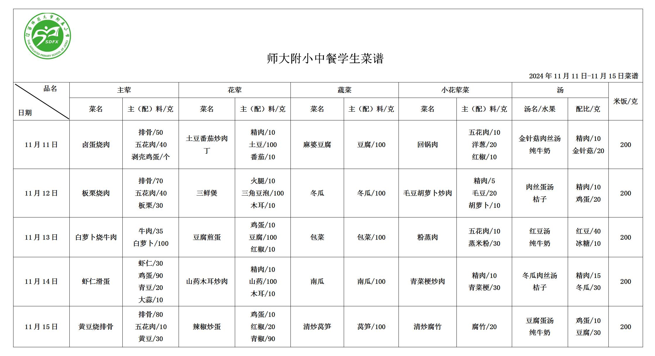 师大附小2024年11月11日-11月15日食谱